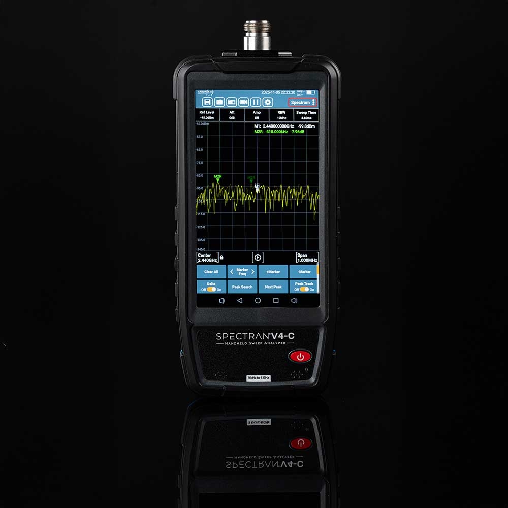 The SPECTRAN V4-C is a high-performance, portable spectrum analyzer designed for professional RF testing, field monitoring, and interference analysis. Covering a wide frequency range from 9 kHz to 6 GHz, it provides exceptional versatility for today’s communication and signal environments. An internal low-noise preamplifier delivers an outstanding sensitivity of -165 dBm/Hz DANL, enabling precise detection of even the weakest signals. With a fast sweep speed of 10 GHz @ 25 kHz and selectable IF bandwidths of 20 MHz / 100 MHz, the V4-C ensures both speed and accuracy.